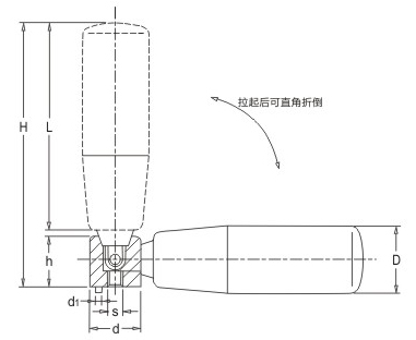 JS.103005 可折手柄 顏色:亮光黑 材質:酚醛樹脂(膠木)或增強尼龍 用途:適用于各類機械上緊固位置的靈活調節 特性:手柄拉出后可90度折疊,提高設備在運行中的安全性