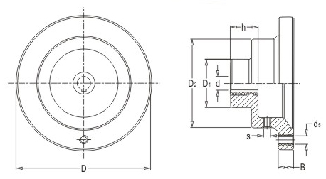 JS.105005 滿輻表盤手輪 顏色:黑色 材質:酚醛樹脂(膠木)、鋁合金 用途:適用于木工、食品、包裝、印刷等機械的精密指示或讀數調節 特性:外形美觀、堅固耐用、機械式結構、