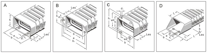 JS.106008 DGT型導管防護套 結構制作與用途 護套是由外套板和內部尼龍框架組合而成,套板采用不銹鋼板或冷軋鋼板拋光鍍鉻處理,內部尼龍框架是由工程塑料增強尼龍66加纖維注塑而成,結構合理,強度高、不變形、外型精美等優點。 安裝方便,適用于各種機床、機械電器、液壓氣動管線的防護和裝飾美化主機整體造型,確保操作人員勞動安全,增強我國機床、機械設備在國際市場的競爭能力。 造型 注明規格與型號如下所示: (1)如1#1200-D-Ⅱ或25×45×1200-D-Ⅱ (2)如3#1800-AD-Ⅲ或45×90×1800-AD-Ⅲ