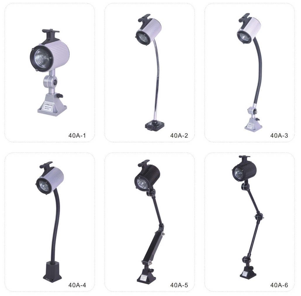 JS.109001 40A系列工作燈 40A-1工作燈采用新光源鹵鎢燈泡,光線柔和,聚光性好,適用各中小型機床,數控機床,鉆銑床、組合機床及其它設備的照明,并具有防水、防爆、防侵蝕等優點。 40A-2、-3、-4工作燈底座350°旋轉,照射角度可任意選擇,聚光效果好。