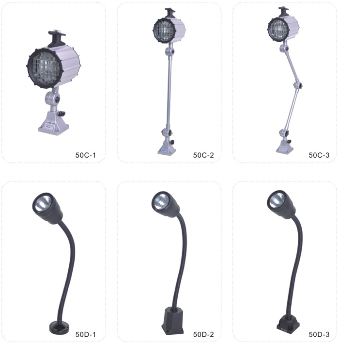 JS.109003 50C、50D系列工作燈 50C工作燈采用新光源鹵鎢燈泡,光線柔和,聚光性好,適用于各種大中型機床,數控機床,加工中心及普通機床的照明,并具有防水、防爆、防侵蝕等優點。 50D適用于中小型機床,醫療設備及汽車修理、船舶檢修、設備維修的工作照明。可內裝電子變壓器,輸入不同電壓。